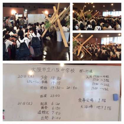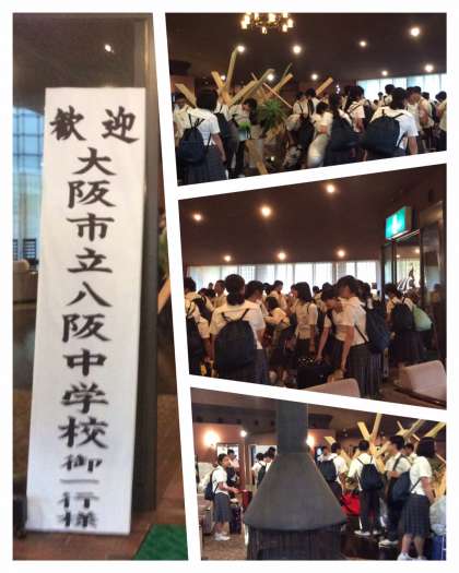 予定より早く、有明ホテルに到着しました。少し雨が降っているので、入館式は行わず、クラスごとに連絡。ベーロンで濡れているので、先に入浴できるように変更しました。