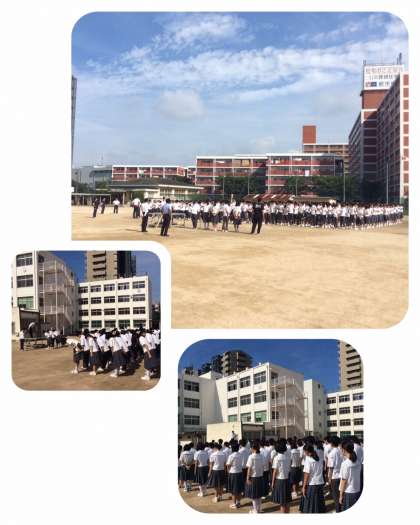 7月4日(月)、昨晩は熱帯夜で朝からどんどん気温が上昇し、とても蒸し暑い中ですが、いつも通り全校集会が行われました。暑くても整列は、きびきびしています。