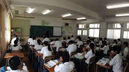 単元名は中部地方〜活発な産業を支える人々のくらし〜で、本時は、工業の発展と地域の変化について展開しました。生徒たちは、普段より緊張気味ですが、集中した授業の様子です。