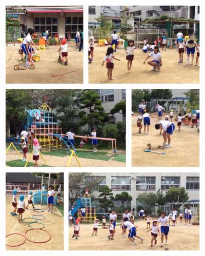 グランドに飛び出した園児と中学生。駆け回る園児たちに中学生は戸惑いながらも一緒に遊びます。安全に配慮してあげる場面も見受けられます。さすが、中学生!