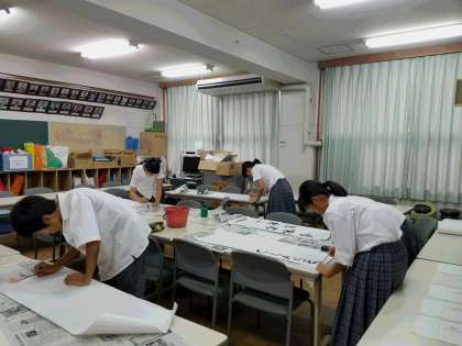 生徒会役員のメンバーは、各学級や学年の取り組みの合間に、プレゼン八阪の運営準備にも取り組んでいます!今日は、舞台発表のときに各団体の発表内容を紹介する『めくり』を作成中です。習字でキレイに書けるかなぁと緊張しながらも頑張っています!
