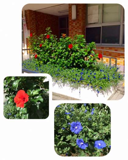 写真は、正門を入った玄関の花壇です。ハイビスカスの赤い花とアメリカンブルーの青い花、そして緑輝く葉のコントラストがとても素敵です。来校者から「とても美しい玄関ですね。」とお褒めの言葉をいただいています。