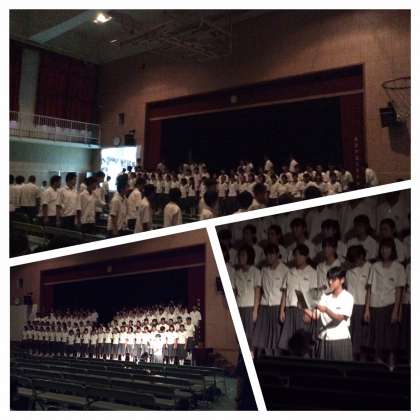 舞台発表の一番手は、1年生の合唱演奏です。ステージ上へ移動している間に、スライドでこれまでの取り組みの様子が映し出されています。
