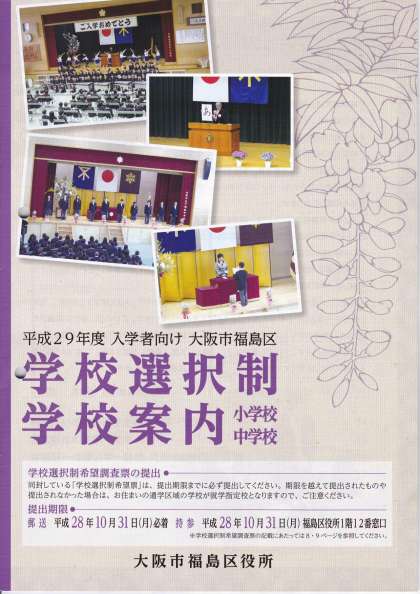 参加される保護者の皆様は、福島区役所から配布された冊子(右の写真)を受付でお示しください。受付で名札をお渡ししますので、校内で着用してください。