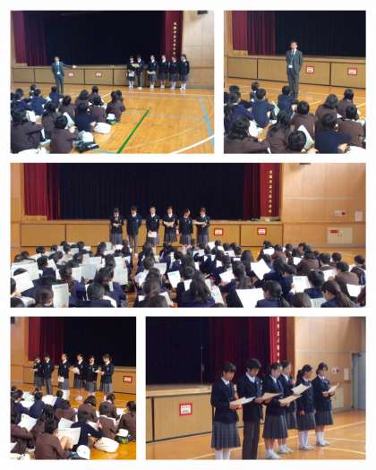 体育館に3小学校が集まり、校長先生からのあいさつの後、生徒会本部役員から中学校についての学校紹介がありました。小学校との違いや知っておいてほしいことなどをプリントも配って、ていねいに説明をしました。