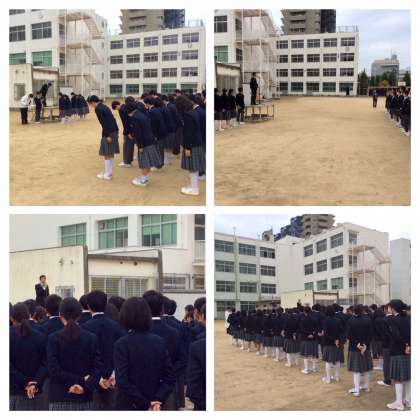 生徒会役員が先週の全校集会の話を受けて、早速「語先後礼」にチャレンジしてくれました。今までやってきたことを変えることは、エネルギーのいることです。こうしてチャレンジする姿勢は、とても大切です。2年生は職場体験であいさつ実践できましたか・・・ 土曜日に鷺洲小学校の土曜授業・作品展があり、少し見学に行ってきました。素晴らしい作品がたくさんあり、君たち中学生も小学校時代に同じように頑張ってきたことが、今のしっかりした中学生の土台になっているのだと感じました。昨日は、大阪城公園で中学生のキックベースボール大会があり、福島区代表として頑張ってくれました。地域の行事に積極的に参加することも大切です。
