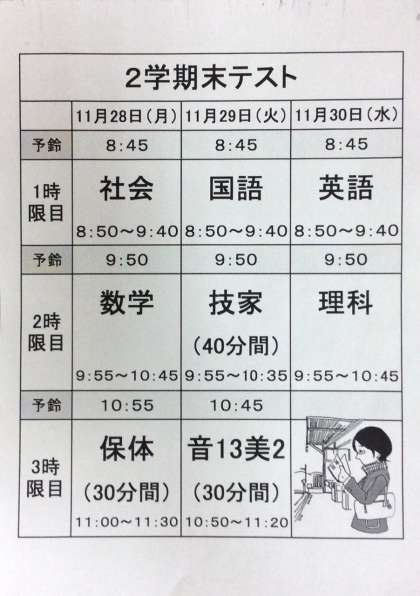 平成28年度2学期末テストが、本日(11月28日)から3日間の日程で行います。