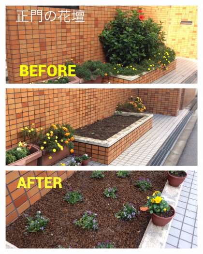 正門前の花壇は、夏秋の花(ハイビスカス・マリーゴールド)から、冬から春の花(アリッサム)に植え替えました。アリッサムは細かい花を密に付け、カーペット状に広がる草花で春に向けて楽しみです。