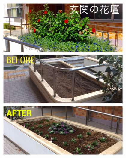 玄関の花壇は、夏の花(ハイビスカス・アメリカンブルー)から、冬の季節には欠かせないハボタンを中心に植え、周囲をチロリアンデージーで囲みました。寒い時期でも花が咲く品種だそうです。