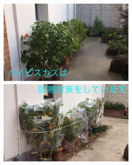 ハイビスカスは防寒対策として、ビニールを巻き付けています。しっかり冬を越して、来年の夏には見事な赤い花を咲かせてくれることだと思います。手入れをしていただいている管理作業員さん、校長先生、ありがとうございます。