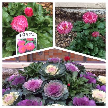 玄関の花壇に葉ボタンとチロリアンデージーを植えています。その花壇に、寒さに負けず咲き出したデージーを見つけました。春に向けて、季節は進んでいるようです。