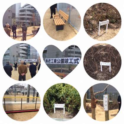 平成29年3月25日(土)、海老江東公園の竣工式が催されました。海老江東連合町会西田会長のごあいさつの後、公園局の方から公園の説明がありました。里山などの遊びゾーンが整備され、クヌギ・レンギョウ・ビヨウヤナギ・ヒラドツツジ・クチナシ・ヤマブキ・コナラ・スダジイ・アジサイが植えられていました。健康広場ゾーンも整備されていました。地域の方々や子どもたちの憩いの場になると思います。、