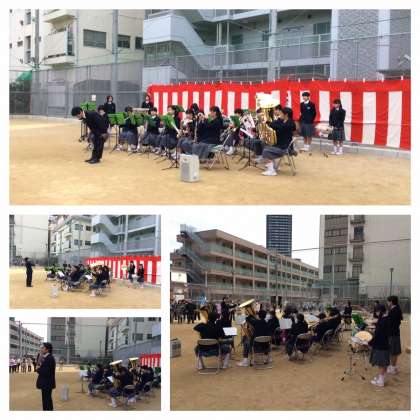 式典には、坂本区長も来られ、ごあいさつの中で、八阪中学校の音楽部にも激励の言葉をいただきました。少し肌寒い中でしたが、音楽部の生徒たちは竣工式のお祝いに演奏を披露させていただきました。