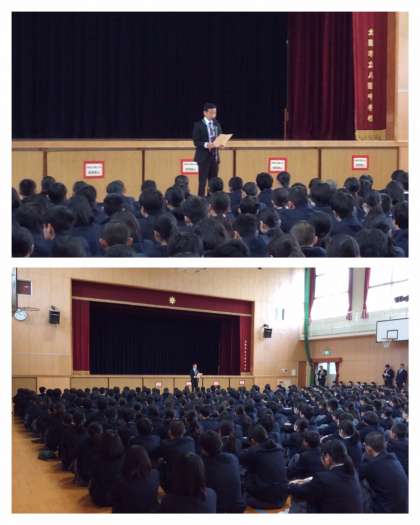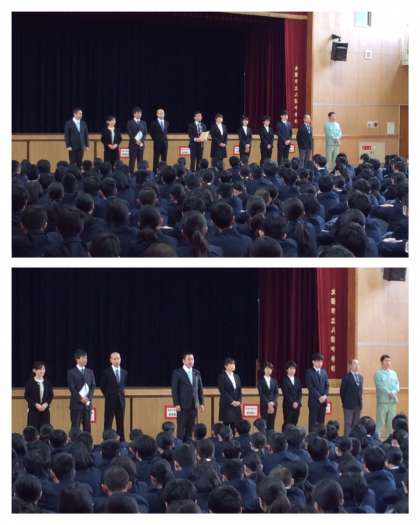 平成29年4月10日(月)、体育館において始業式に先立ち離任された教職員の紹介と新しく着任された教職員の紹介が校長先生より発表されました。
