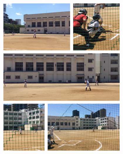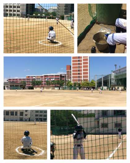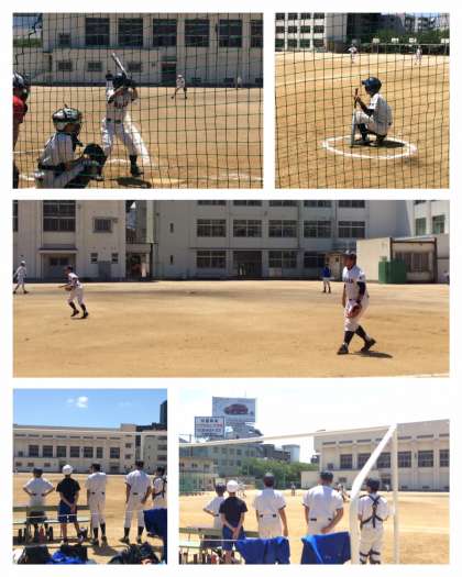 グランドでは真っ青な青空の下、野球部が練習試合(対旭陽中)を行っています。頑張れ! バックネットを整備したので、とてもスッキリしていてネット裏からの視界が広がっています。
