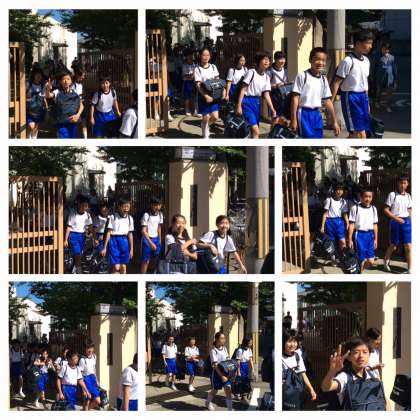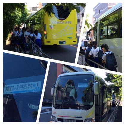 生徒たちの顔が輝いています。ウキウキしながら学校を出発。バスへの乗車です。