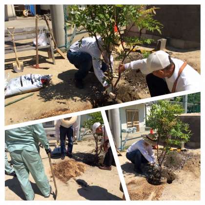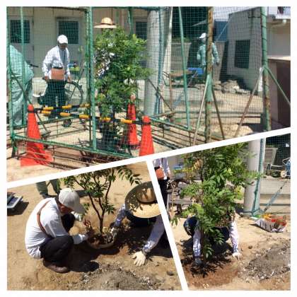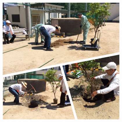 平成29年5月18日(木)午後、創立70周年記念事業において、校庭に「藤棚」を創ることになり、棚よりも一足早く、「のだふじ」の苗木を植樹しました。