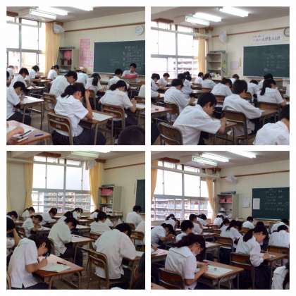 平成29年5月24日(水)、中学生になって初めての定期テスト。1時間目は数学です。少し緊張しながら、真剣にテスト問題に臨んでいます。学習した成果を発揮してほしいものです。頑張れ!