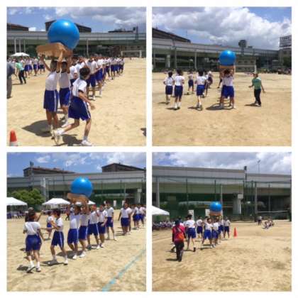 箱に入れた大玉を頭上にあげて送っていきます。慌ててもダメ、のんびりしていてもダメ、上手く力まずにタイミングを合わせて送っていくとスピーディな移動ができます。チームワーク。知恵。リード。担任の先生も声をからせて応援しました。