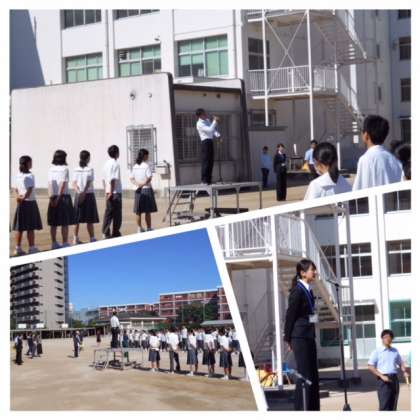 今日も眩しい青空の朝です。日差しはきついですが、空気が乾いていて心地よいです。朝の全校集会が、生徒会の号令から始まりました。