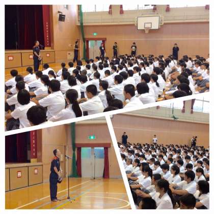 体育館では、消防署の方から「消火・通報・避難」についてコンパクトにお話をしていただき学習を深めました。