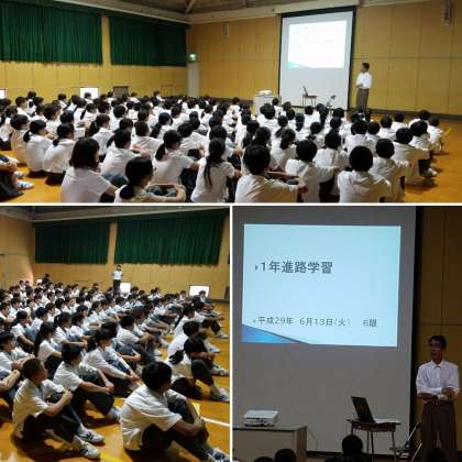 6月13日(火)6限 1年生は進路学習をしました。中学校に入学して、まだ2か月ですが、今後の中学校生活を有意義にするため、進路指導主事の先生にお話しをしてもらいました。