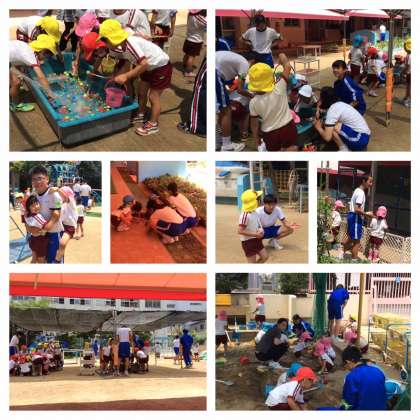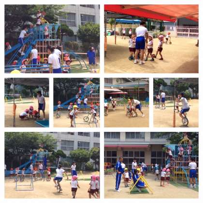 教室から校庭へ。園児たちのテンションが上がります。中学生も「鬼ごっこする人、集まれ!」と元気よく声をかけたり、積極的にリードしているグループもあり、溶け込んだ状態です。滑り台・一輪車・鉄棒・スーパーボールすくい・泥遊び・鬼ごっこ・肩車・ウサギ小屋・チョウの幼虫・竹馬・フラフープ・・・・子供は遊びの天才です。中学生は、童心に帰って一緒に遊びながらも、周囲の状況を見渡し安全に配慮している様子もうかがえます。さすが、中学生!遊びではなく、あくまでも保育実習です。