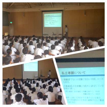 私立高校、公立高校の特徴や入試の仕組みなど、進路指導主事の林先生から、丁寧に詳しくお話がありました。大変暑い環境の中でしたが、しっかり聞けていました。