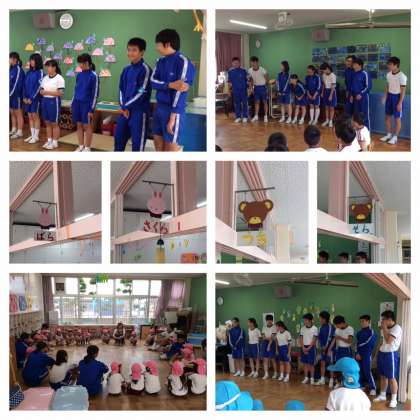 各教室で、大きな声でごあいさつ。自己紹介をしたり、中学生が幼稚園児の時の想いでを語ったり、手をつないで音楽に合わせて活動したり、とても楽しそうです。