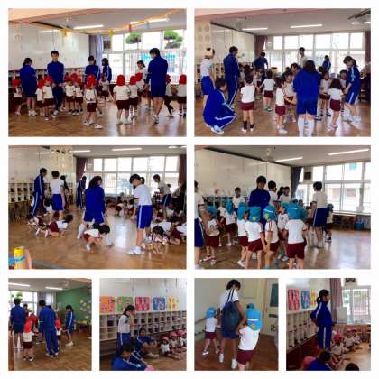 平成29年6月22日(木)2・3時間目、3年4組が貫江田幼稚園に保育実習に行きました。園児たちが出迎えてくれ、手をつないで各教室へ移動します。