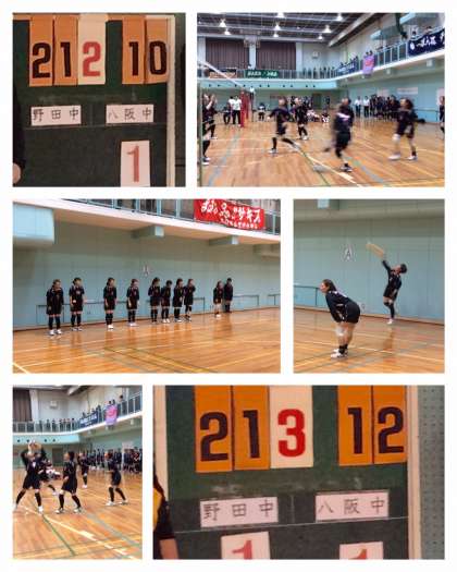 八阪中対野田中の一戦です。第1セットは八阪のペースで得点を積み重ねます。いいリズムのまま21対11で勝利!