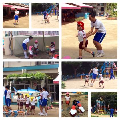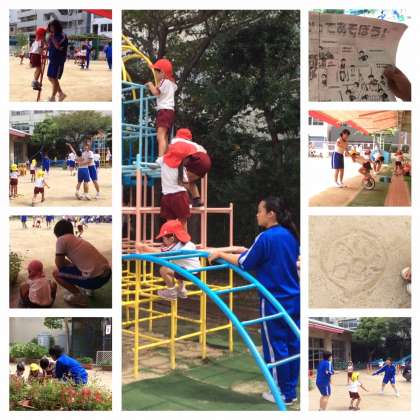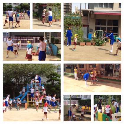 教室から外へ飛び出していきます。爽やかな天気なので子どもたちの動きが活発です。走り回っている人、追いかけっこや鬼ごっこをしてるグループ、なわとびを園児が跳びやすいようにやさしく回してあげている中学生、一輪車や竹馬の補助・・砂場でお山を作ったり、プランターの周辺で虫さがしをしたり、地面にアンパンを描いてあげたり・・・ジャングルジムでは園児を見守るやさしい中学生・・・一緒に遊びながらも、安全に配慮している中学生、さすがです!