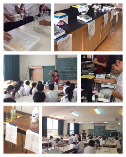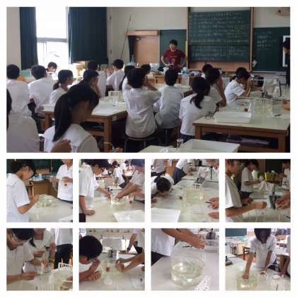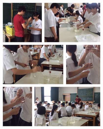 各班で作成している「実験計画書」に基づいて、実験を進めます。道具や薬品を準備し、実験装置を設置し、いよいよ実験開始。気体を収集している姿は、未来の科学者です。「大根おろし」がうまく反応しなくて苦労している様子ですが、真剣な表情で試験管を見つめています。実験の大詰めは、収集した気体にせんこうを入れるとどうなるか?石灰水を入れるとどうなるか?生徒の興味・関心を上手に引き出す授業が展開されていました。