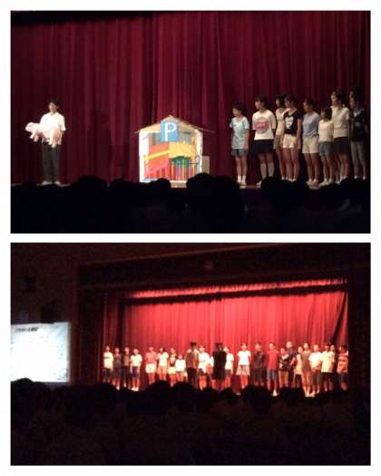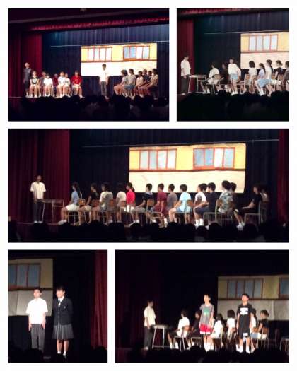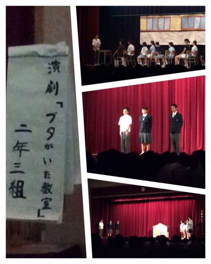 2年3組の劇は「ブタがいた教室」です。「生命と向き合う」---大きなテーマを扱った劇です。日頃、特に意識せずに食べている野菜や魚、そして肉。みんな生命です。舞台は、とある教室。担任の先生の提案で、ブタを育てて食べる取組がおこなわれます。芽生える愛情。生命を奪って食べることへの抵抗感。本来、私たちが日々向き合わなければならない問題を真正面から取り上げたクラス劇が立派です。