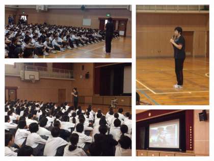 大谷さんは中学校2年生でバレーボールと出会い、厳しい練習を乗り越えて、今の自分がある。ぜひ、中学生で打ち込めるものを何か見つけてほしいと語られた後、これまで取組んだ2本のDVDを流されました。