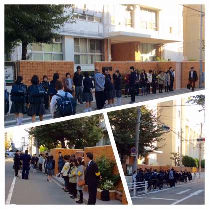 平成29年11月2日(木)、爽やかな清々しい朝です。正門にPTAの方々、PTAOB会(弥栄会)の方々、生徒会役員、教職員が並んでいる中を、生徒たちが「おはようございます!」と大きな声であいさつをして登校しています。3年生は大事な実力テストがあり、少し緊張している様子がうかがえます。挨拶と同時に心の中で「テスト頑張れ!」と声をかけます。とても気持ちの良い朝の登校風景です。