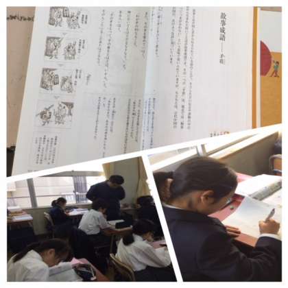 故事成語の授業です。前時までに学習した内容をもとに、本時は、資料集にあるさまざまな故事成語から1つを選び、その意味を自分の言葉でつかんだ後に、イメージを膨らませてその故事成語に沿ったストーリーを考え、4コマ漫画に仕上げて表現するという授業です。教科書では「矛盾」を例に同様の学習しました。