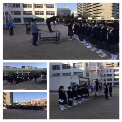 つづいて伝達表彰です。活躍した生徒たちに賞状が手渡され、皆で拍手をおくりました。福島区将棋大会で3位となった木村くん、大阪市総合文化祭で素晴らしい演奏を発表した音楽部、同じく総合文化祭で素晴らしい美術作品を出展したみなさんです。秋の深まりとともにますます勉強にも活動にも頑張る八阪中学校生であってほしいです。
