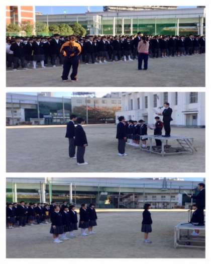 11月13日(月)、朝の全校集会をおこないました。今週も気持ちのよい青空です。空気は冷たくじっとしていると身体が震えるほどです。