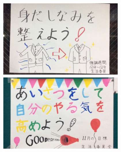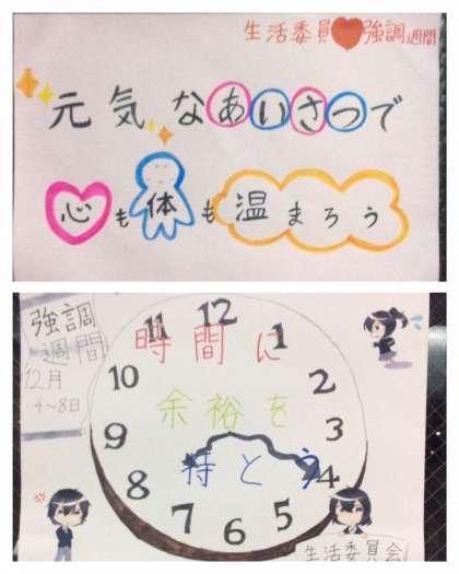 玄関にポスターも掲示し、今週は冬の強調週間に取り組んでいます。今週になって、急に冷え込みましたが、生徒会役員・生活委員が毎朝正門に立って、あいさつ運動等に頑張っています。