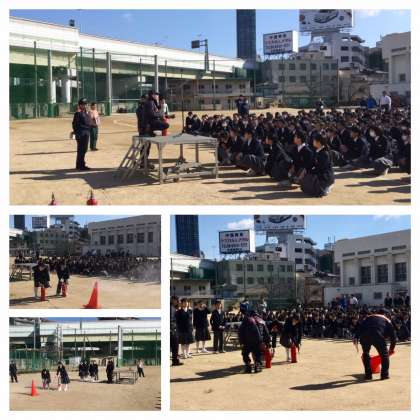 揺れがおさまったという放送で、グランドへ避難します。グランドに出たら、駆け足。素早い行動です。福島消防署海老江出張所より3名の隊員の方に来ていただき、生徒たちの様子を見ていただきました。集合完了までの時間、3分21秒。