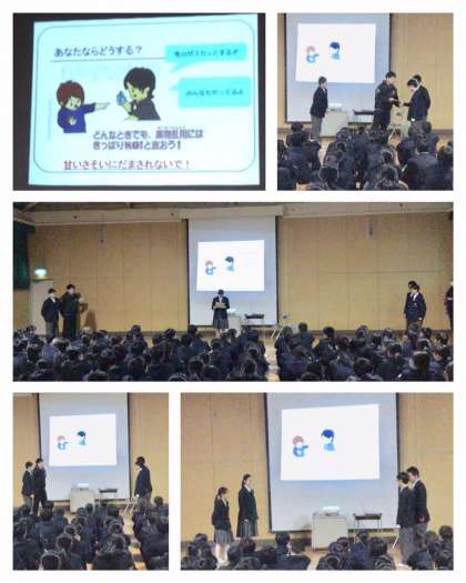 天野先生のプレゼンテーションの内容に合わせて、保健委員が「誘われたらどうする?」のロールプレイを演じてくれました。もし先輩から薬物を使ってみなよと誘われたらどうしよう…断り切れずに受け取ってしまった友だちから相談を受けたら、何て言ってあげよう…保健委員の演技を見ながら、自分だったらどうしたらいいだろうかと考えました。