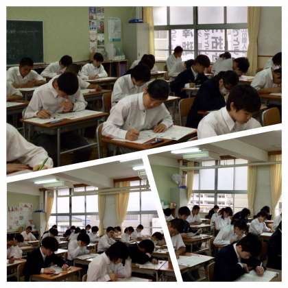 1時間目、社会科のテストを真剣なまなざしで取り組んでいます。進路に向けての第一歩。落ち着いて頑張れ!