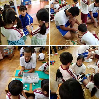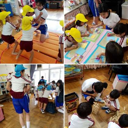 室内では、相撲、ブロック、お絵かき、粘土、おままごとなど、工夫して楽しく遊びます。