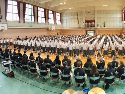 歓迎の気持ちを込めて、八阪中学校の校歌をキャンバーウェル・ハイスクールのみなさんに聴いていただきました。吹奏楽部の伴奏で全校生徒で校歌1番を斉唱!大きな拍手をいただきました。