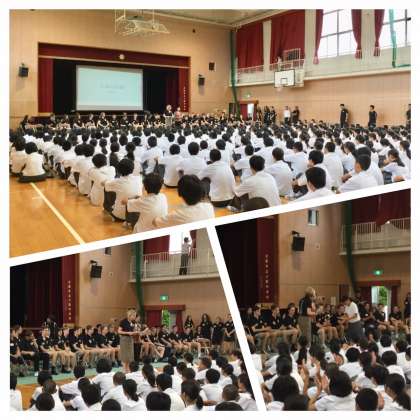 引き続いて、Jill Laughlin校長先生よりご挨拶。日本各地を回ってきて日本の素晴らしさを実感しました・・・今日の八阪中学校の交流をとても楽しみにしています。・・・