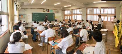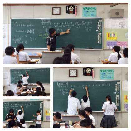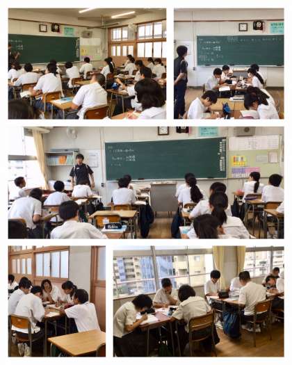 平成30年7月6日(金)2限目、2年4組で数学の研究授業をおこないました。本時のねらいは、1次関数の値の変化についての理解です。本校の教育目標に掲げている、「生徒が意欲的・主体的に学習に取り組める指導方法を工夫し、『50分間集中した授業』を推進する」が実践されています。チャイムと同時に、集中!変化の割合についての説明のあと、練習問題が提示され、班になって共に考えます。悩んでいる友達に、教えてあげることでお互いの理解が高まります。解答を、前の黒板に生徒が板書します。わかりやすく先生が説明し、「比例、1次関数の割合は、比例定数aと等しい」ポイントを確認します。引き続き問題に挑戦し、本時のまとめに入ります。次回への予告と同時に終わりのチャイムが鳴りました。まさしく『50分集中した授業』が展開されていました。