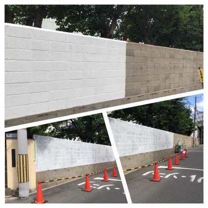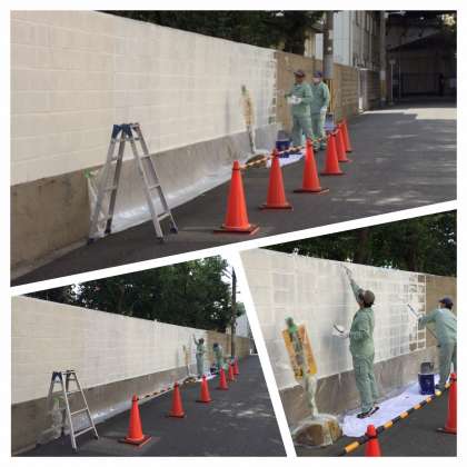 東側のブロック塀に関しては、地震の前から塗装して明るくしようと計画していたものです。東門側から塗装をはじめて、ごみセンターまで美しい白い塀に仕上がっていきます。強烈な暑さの中の作業、ありがとうございます。