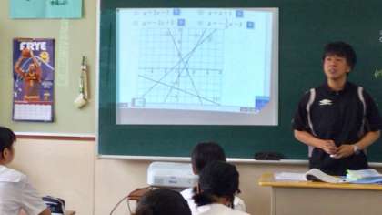 1次関数の値の変化をグラフで表します。プロジェクターでグラフを写し出し、班で考えながらみんなで理解していきます。今まで、直線を黒板にチョークで書いていましたが、デジタル教材を活用することで、直線を変化させたり、出したり消したりすることが容易にできるようになり、時間効率がよくなりテンポの良い授業が展開されています。また、デジタル教科書を使うことで、教科書に載っている問題を黒板に写すことができ、生徒の理解度もアップしています。今後も単元によって、ICTを活用しながら、興味の湧く授業づくりをしていきます。