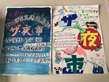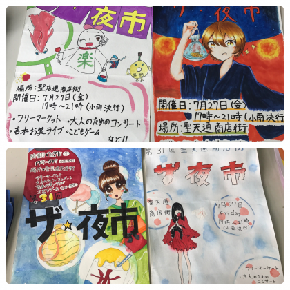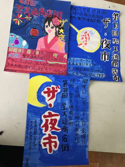 美術部では、6月に依頼を頂いた聖天通商店街で行われる[ザ、夜市]のポスター作りを行っていました。みんな何時間もかけて、一生懸命制作していまた。色とりどりのポスターが出来上がりました。